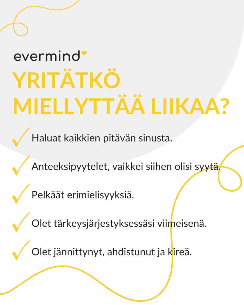 Mistä sitten voi tietää, onko oma miellyttämisen tarve mennyt liian pitkälle? Psykoterpeutti Sharon Martin listaa Psychology Today -lehdessä miellyttäjän 15 tunnusmerkkiä.